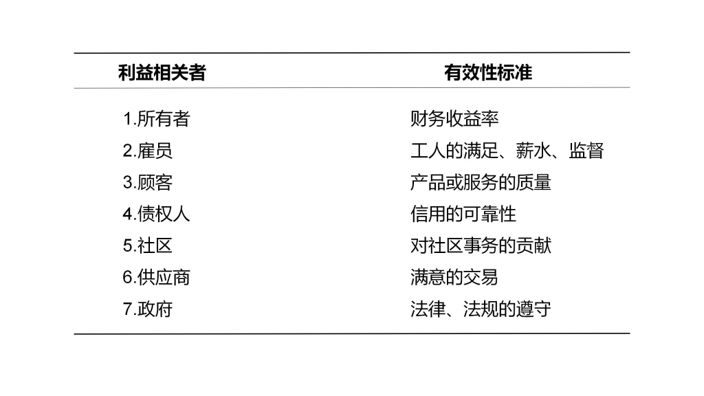 利益相关的调查表明,小企业要同时满足所有集团的要求是困难的。一个企业可能有较高的雇员满意程度,但其他利益集团的满意程度可能较低。然而,衡量所有 7个方面利益相关者比衡量其中单方面的有效性更为准确,评价组织如何面对每个集团而行动,为组织提供了一个全面的有效性评价。