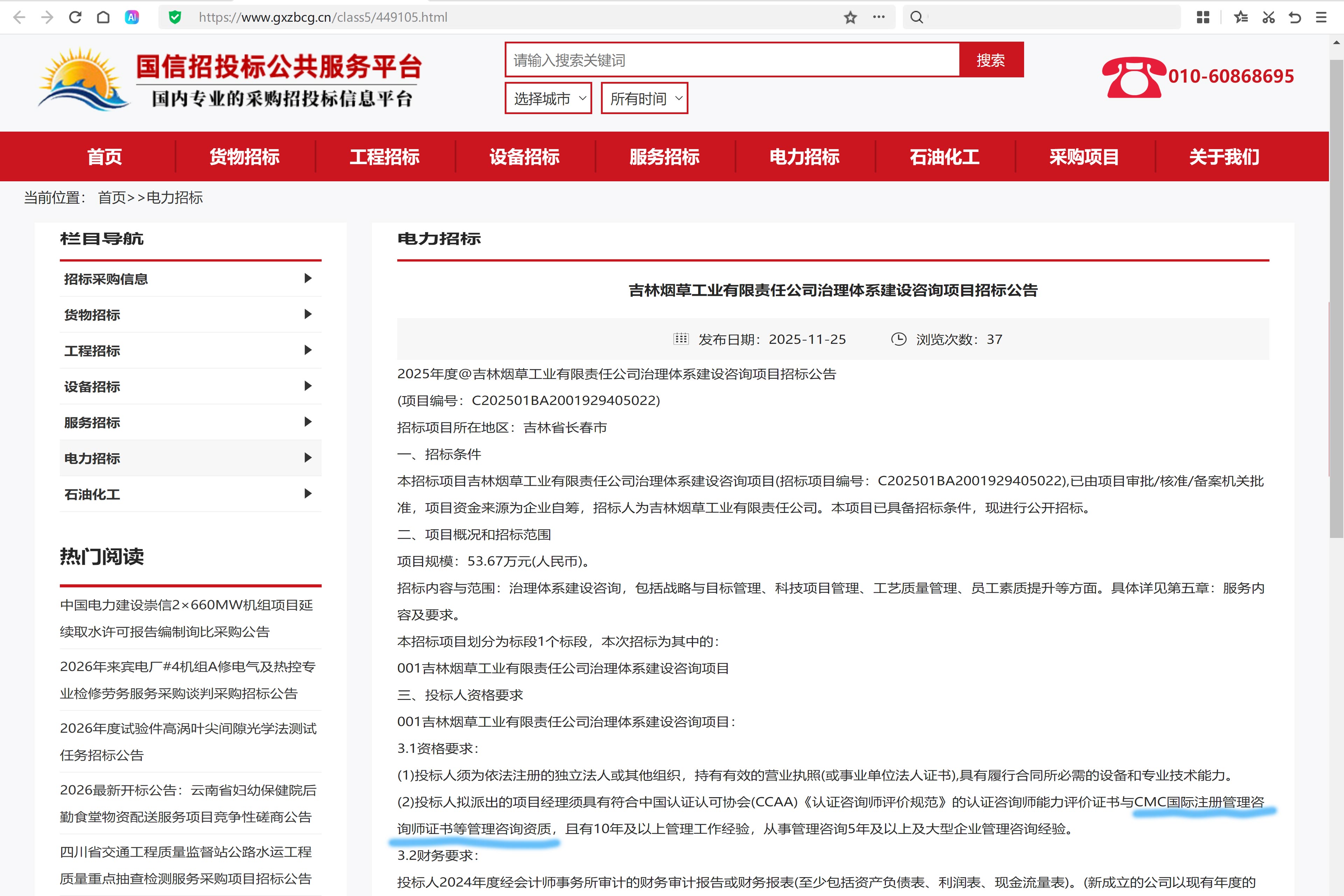 吉林烟草工业有限责任公司治理体系建设管理咨询项目招标明确要求提供CMC协会/国际咨询协会的CMC资格“CMC国际注册管理咨询师证书等管理咨询资质”。