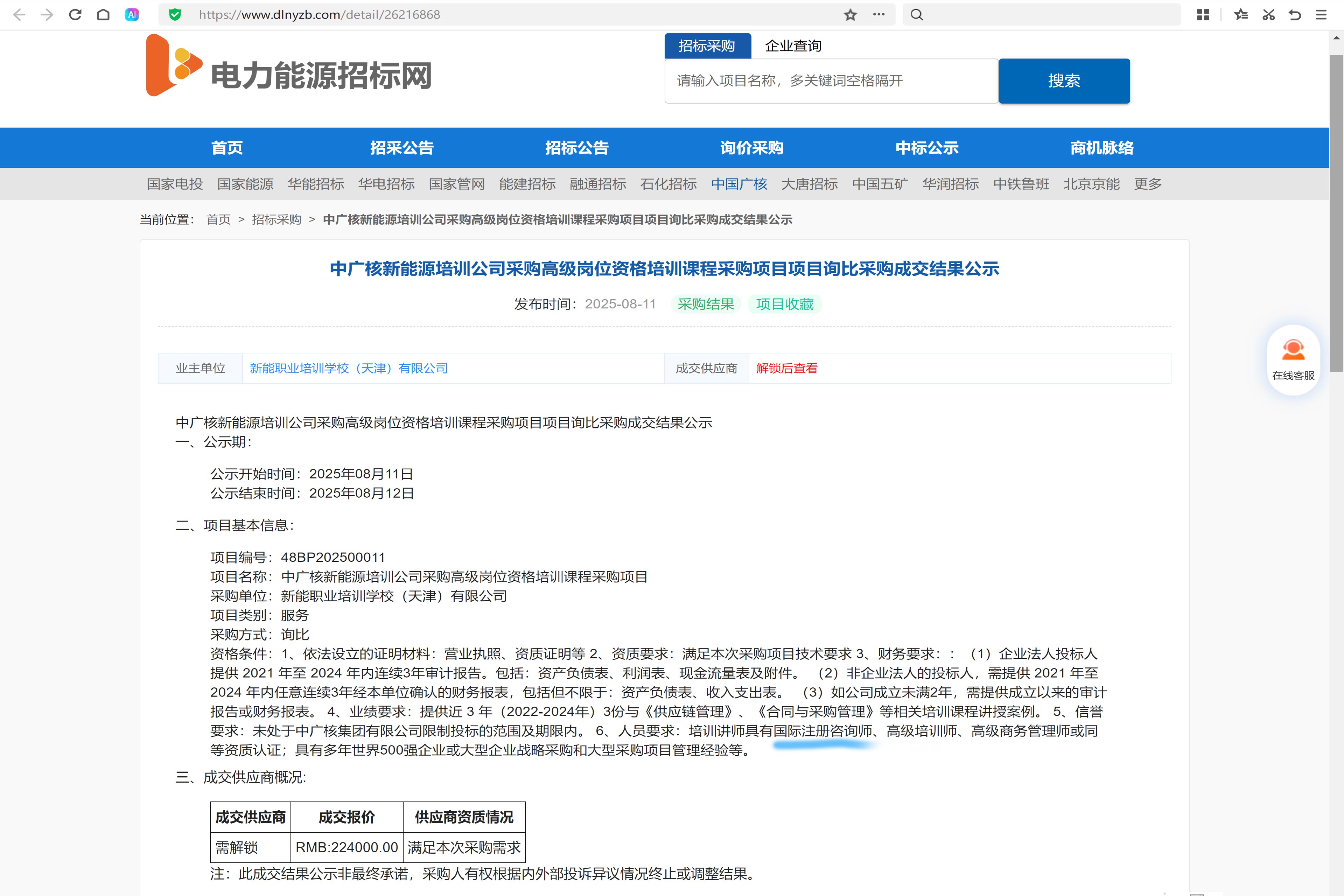 中广核新能源培训公司采购高级岗位资格培训课程采购项目项目询比采购成交结果公示