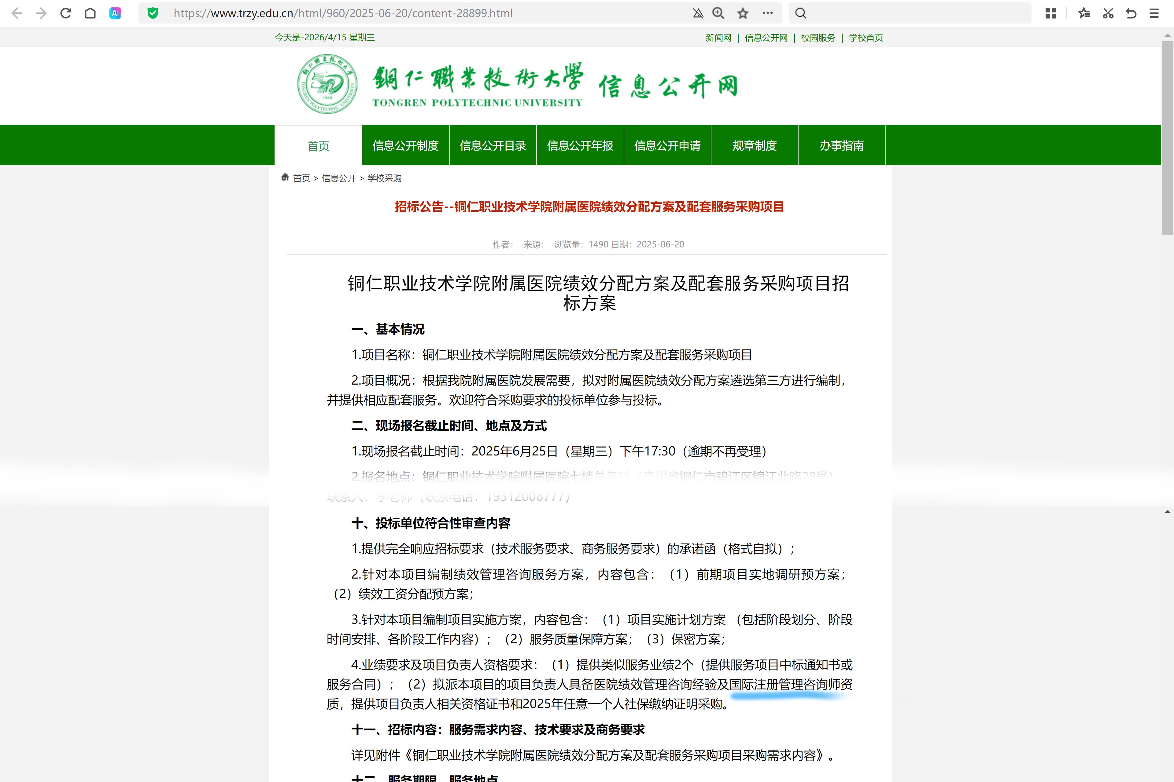 一、基本情况1.项目名称:铜仁职业技术学院附属医院绩效分配方案及配套服务采购项目