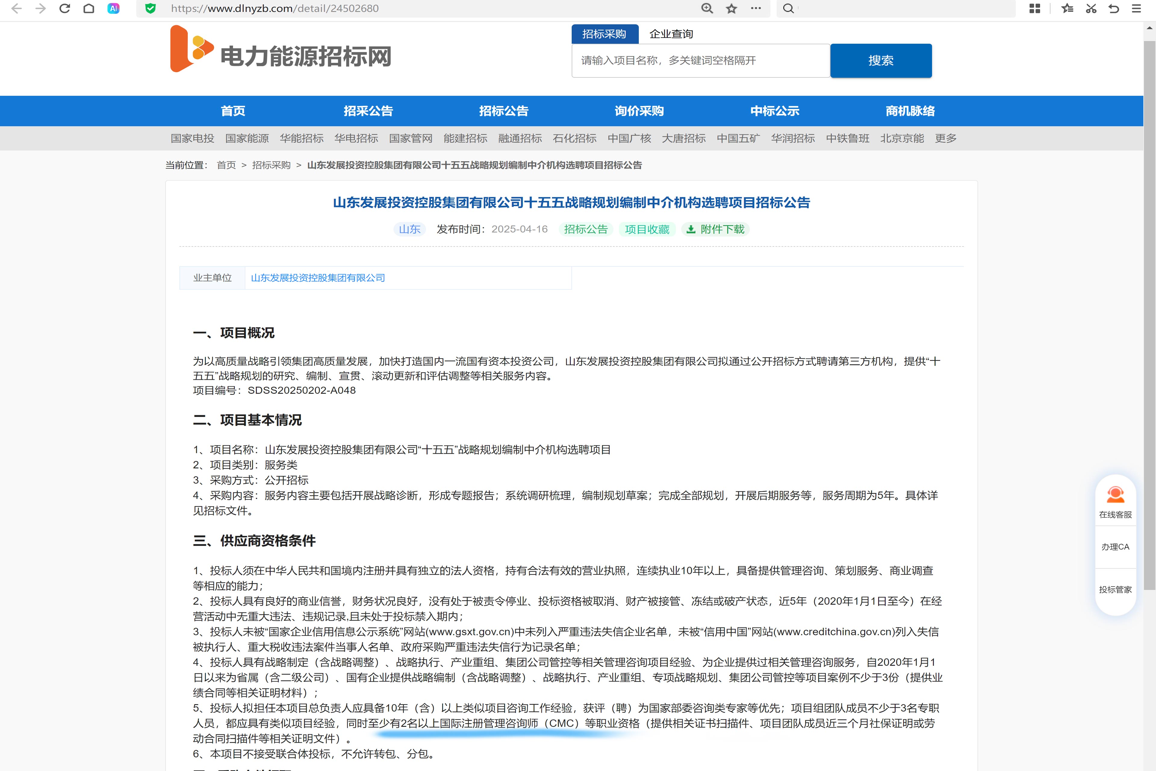 实例4:山东发展投资控股集团有限公司十五五战略规划编制中介机构选聘项目招标要求CMC®