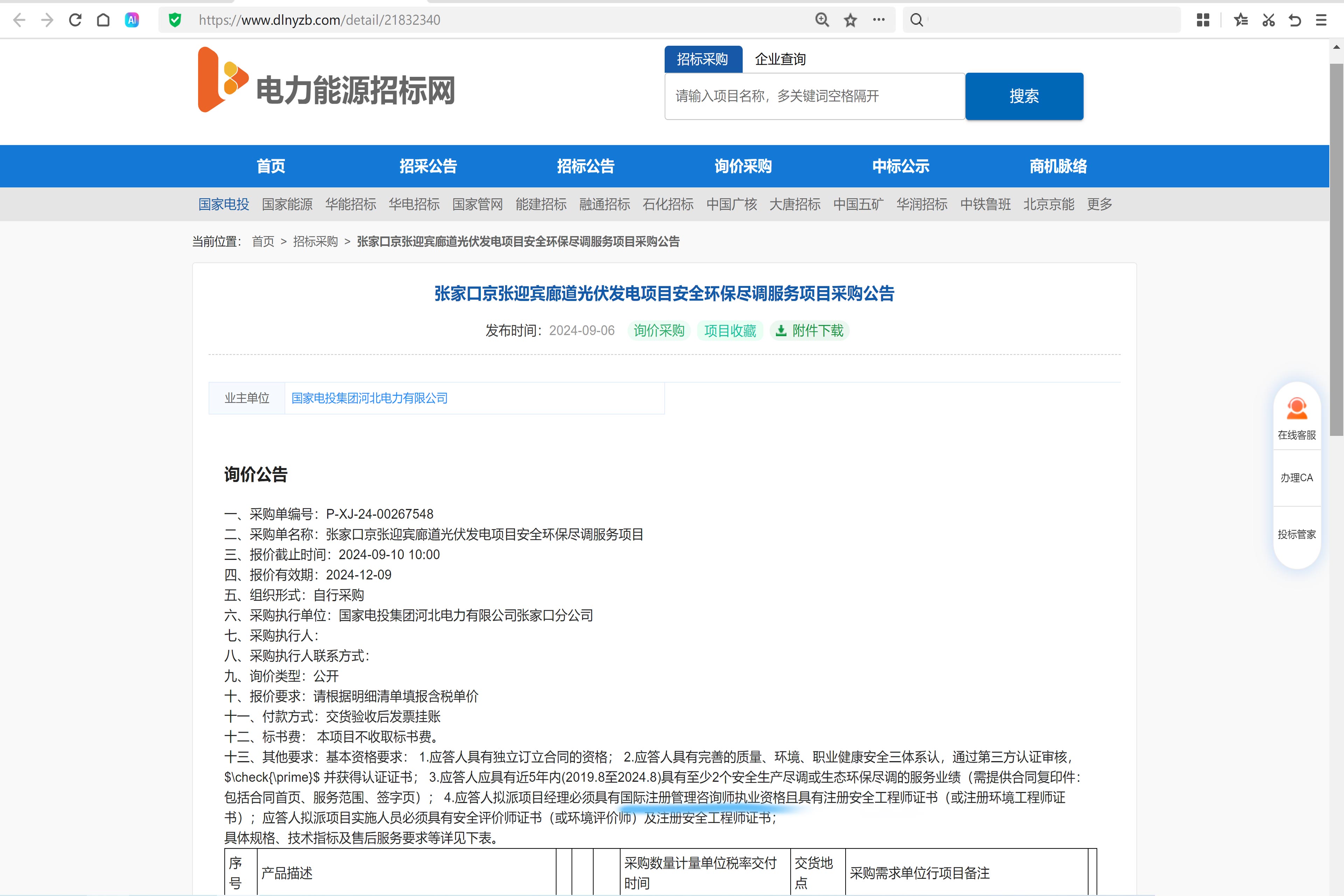 一、采购单编号:P-XJ-24-00267548二、采购单名称:张家口京张迎宾廊道光伏发电项目安全环保尽调服务项目