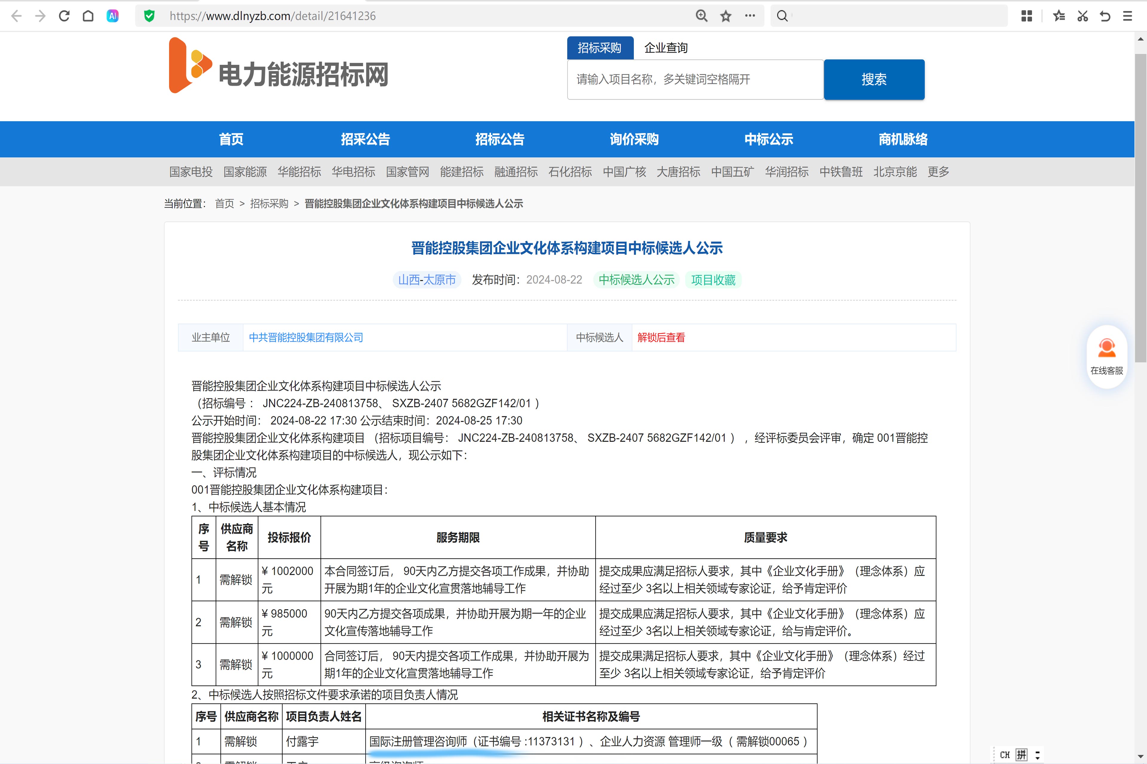 晋能控股集团企业文化体系构建项目中标候选人公示(招标编号:JNC224-ZB-240813758、SXZB-2407 5682GZF142/01)