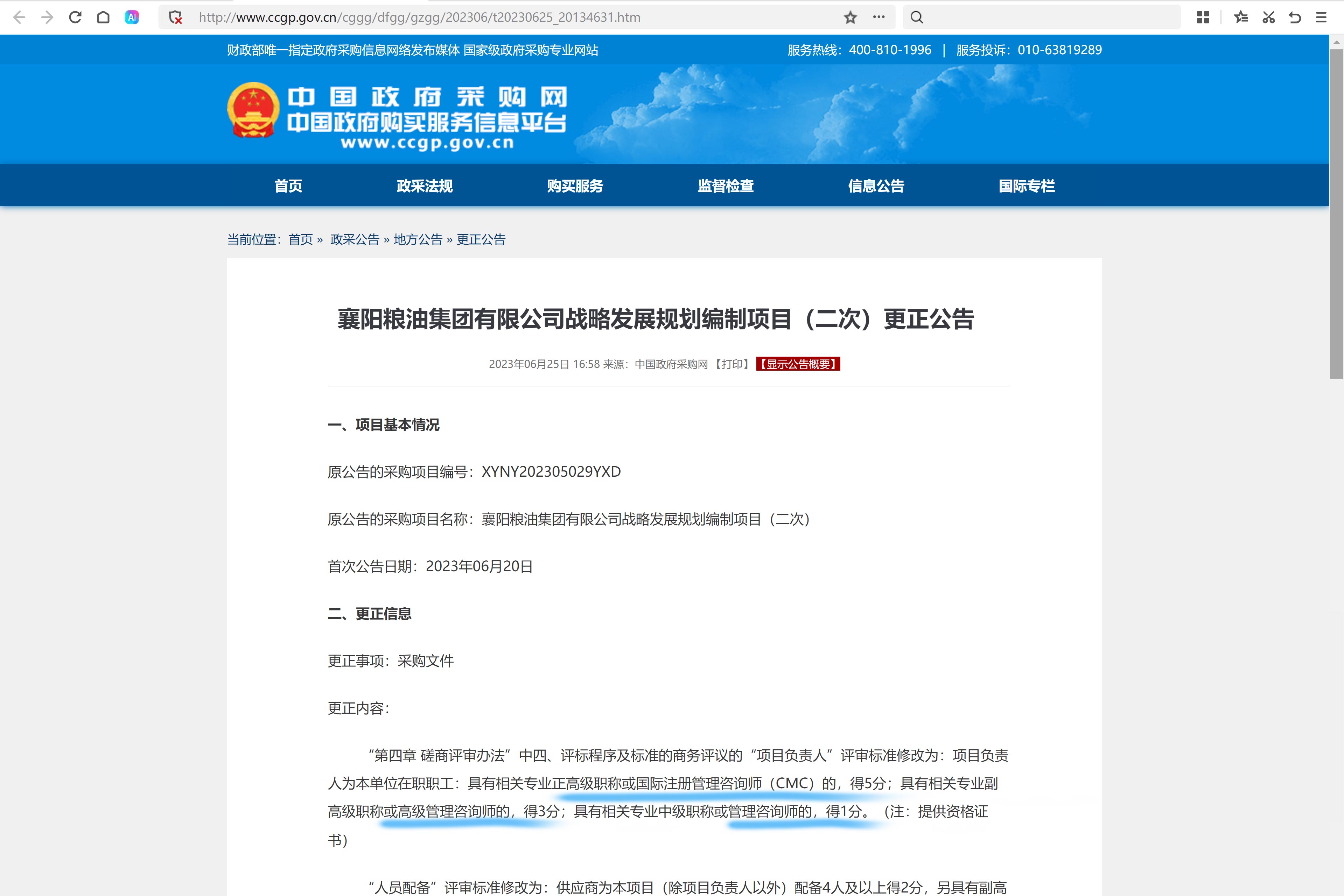 襄阳粮油集团有限公司战略发展规划编制项目招标公告明确要求提供CMC协会/国际咨询协会的CMC资格“项目负责人为本单位在职职工:具有相关专业正高级职称或CMC国际注册管理咨询师的,得5分;具有相关专业副高级职称或高级管理咨询师的,得3分;具有相关专业中级职称或管理咨询师的,得1分。(注:提供资格证书)”。